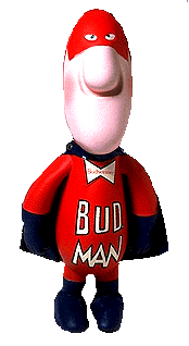 When Anheuser-Busch, Inc. was in a quandry in the late 60's, looking for a way to appeal to the college crowd, Bud Man flew to their rescue. Wearing a red super-suit and blue cape, boots and gloves, he delighted college coeds on campuses all across the country. His dapper bowtie says Budweiser on it, and his name is plastered in larger than life letters across his chest. He's about 18 inches tall.